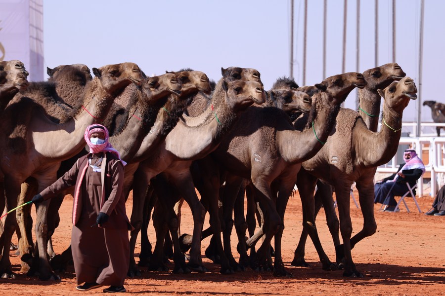 Photo taken on Jan. 5, 2022 shows a camels beauty contest during the King Abdulaziz Camel Festival held in the northeast of Riyadh, capital of Saudi Arabia (Xinhua/Wang Haizhou)