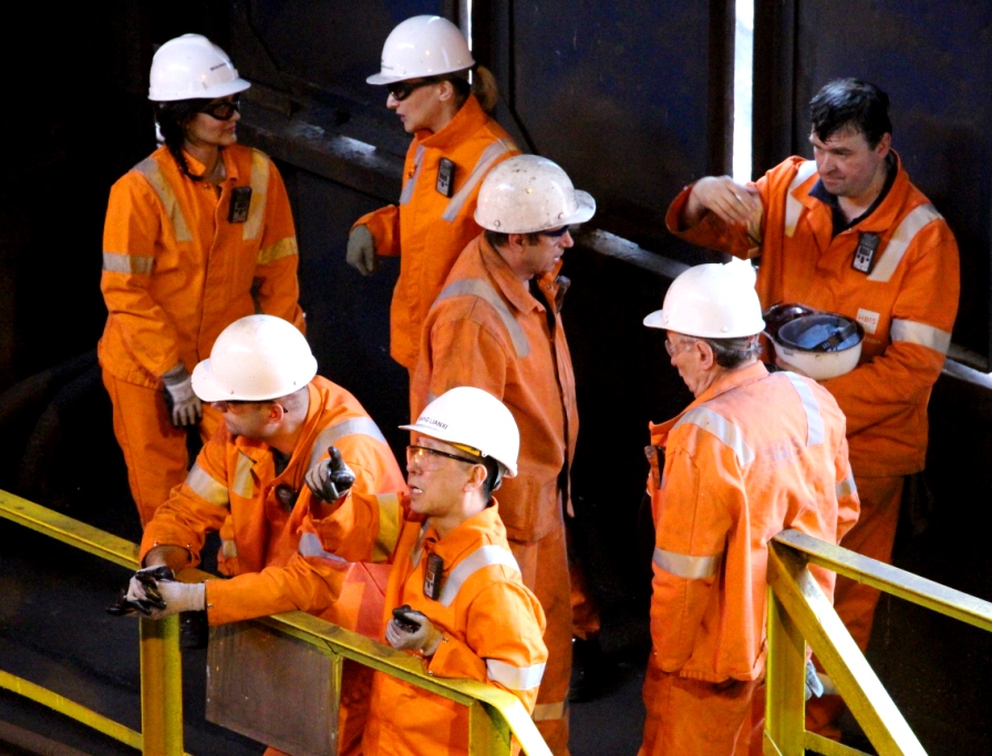 Chinese and Serbian staff of HBIS Serbia check the operation of steelworks in Smederevo, Serbia, April 12, 2018. (HBIS Serbia/Handout via Xinhua)