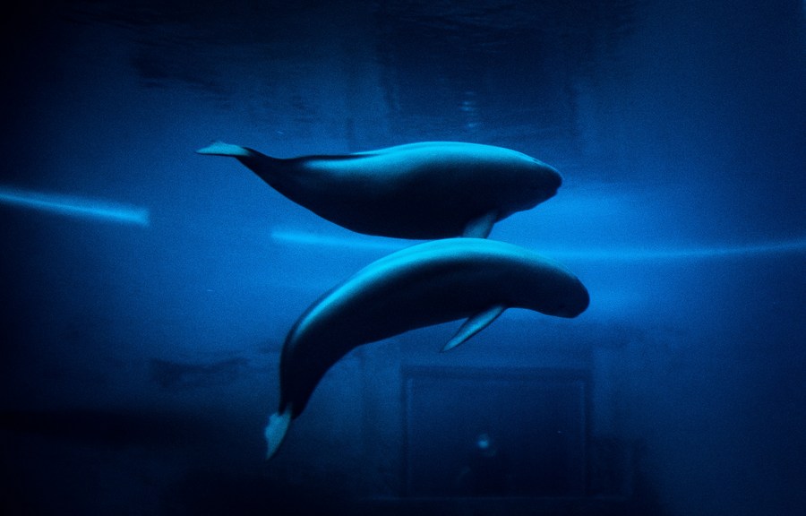 Yangtze finless porpoise YYC swims with its mother in the water at the Institute of Hydrobiology (IHB) of Chinese Academy of Sciences in Wuhan, central China's Hubei Province, July 5, 2021. (Xinhua/Xiao Yijiu)