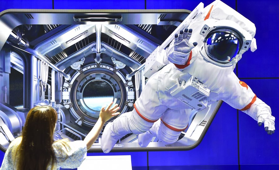 A journalist views the 3D display products at the venue of the 2021 Smart China Expo in southwest China's Chongqing Municipality, Aug. 22, 2021. (Xinhua/Wang Quanchao)