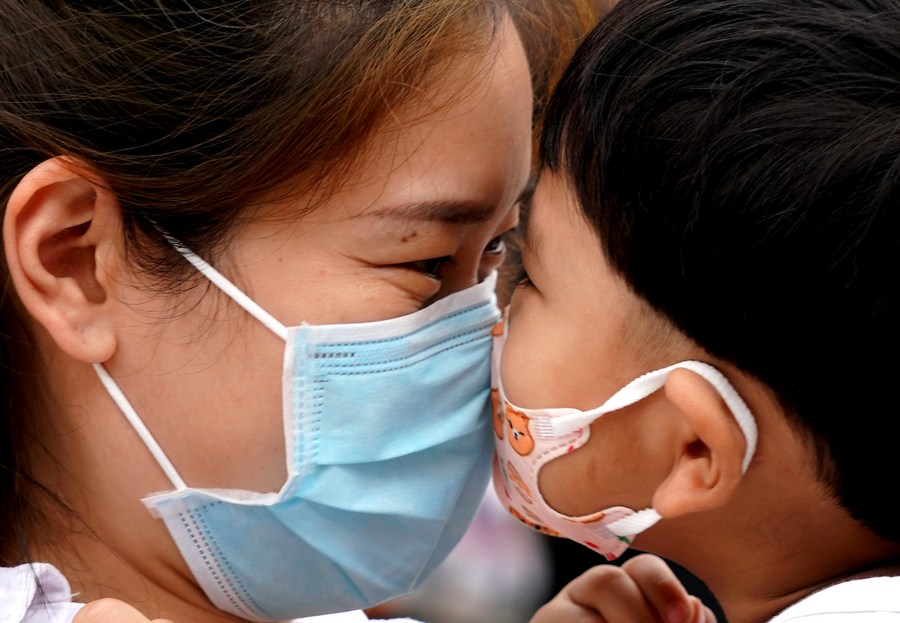 A resident named Li Jing greets her son after a few days of separation, as restrictions were lifted at a community in Zhengzhou, central China's Henan Province, Aug. 28, 2021. Zhengzhou cleared all its medium- and high-risk areas for COVID-19 on Aug. 28, 2021, with closed-management measures in affected areas lifted. (Xinhua/Li An)