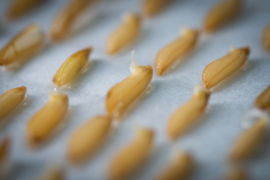 Photo taken on Feb. 26, 2021 shows sprouting rice seeds that had made a round trip to the moon aboard the Chang'e-5 probe at the greenhouse of the National Engineering Research Center of Plant Space Breeding of South China Agricultural University (SCAU) in Guangzhou, south China's Guangdong Province. (Photo by Zhang Ziwang/Xinhua)