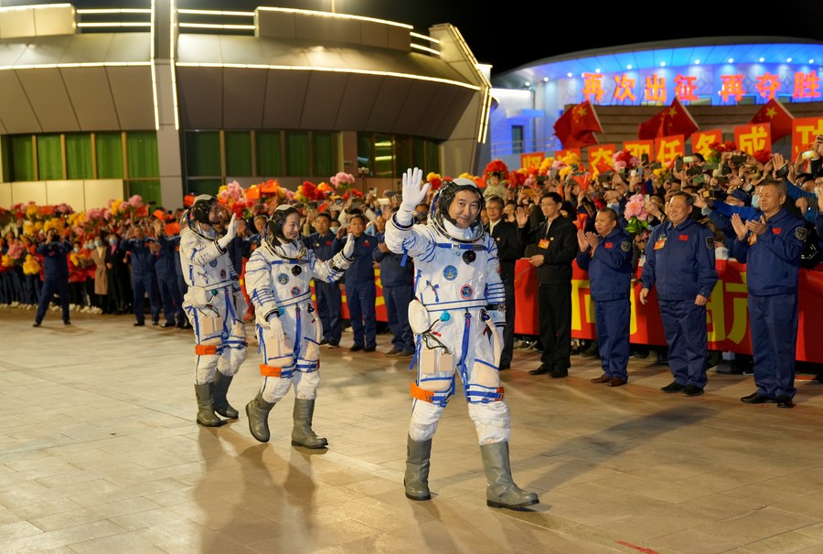 A see-off ceremony for Chinese astronauts Zhai Zhigang (R), Wang Yaping (C) and Ye Guangfu of the Shenzhou-13 crewed space mission is held at the Jiuquan Satellite Launch Center in northwest China, Oct. 15, 2021, ahead of their six-month mission in space. (Xinhua/Li Gang)