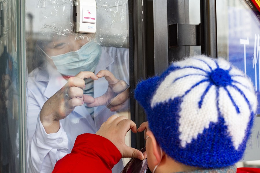 Zheng Yingying, a medical worker from People's Hospital of Daowai District of Harbin, makes a hand heart gesture to her visiting son behind a glass door at a quarantine center of COVID-19 in Harbin, northeast China's Heilongjiang Province, Feb. 11, 2021. (Xinhua/Xie Jianfei)
