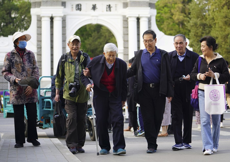 Tsinghua alumni walk with their teacher Xie Hongyi (3rd L) at Tsinghua University in Beijing, capital of China, April 24, 2021. Tsinghua University commemorated its 110th anniversary on April 25, 2021. (Xinhua/Xing Guangli)