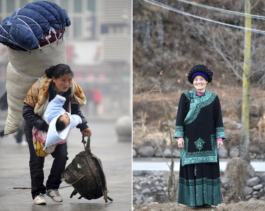 Combo photo shows Bamu Yubumu trudging toward the Nanchang Railway Station with luggage on her back and baby in her arm, in Nanchang of east China's Jiangxi Province, Jan. 30, 2010 (L) and Bamu Yubumu posing for photo in traditional attire of Yi ethnic group in Taoyuan Village, Yuexi County, Liangshan Yi Autonomous Prefecture, southwest China's Sichuan Province, Jan. 22, 2021.