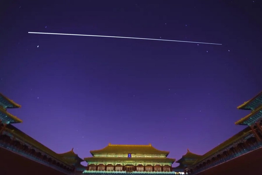 Photomontage taken on Nov. 19, 2021 shows China's space station flying over the Wumen Gate of the Palace Museum in Beijing, capital of China. (Xinhua/Xing Guangli)