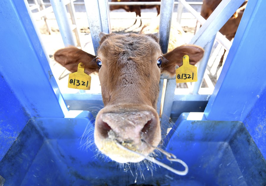 Photo taken on Feb. 5, 2021 shows Qinchuan cattle at China's National Beef Cattle Improvement Center in Yangling, northwest China's Shaanxi Province. (Xinhua/Li Yibo)