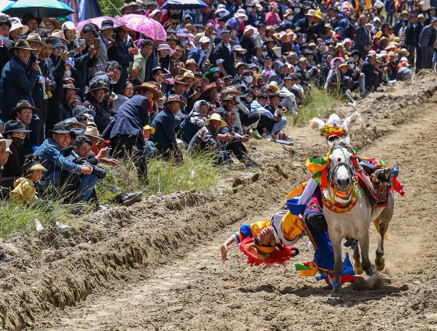 A rider competes during a horse race celebrating the harvest season in Gangdan Village of Gonggar County, southwest China's Tibet Autonomous Region, Aug. 26, 2021. (Xinhua/Sun Fei)