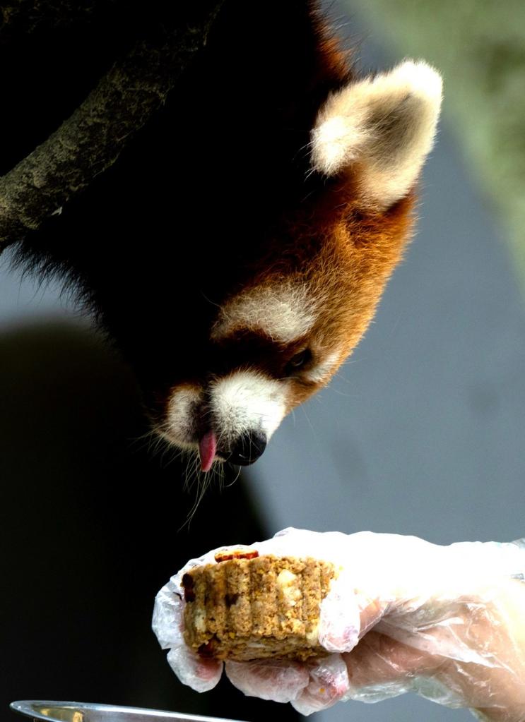 A red panda is fed on a customized mooncake ahead of the Mid-Autumn Festival in Shanghai Zoo in east China's Shanghai, Sept. 20, 2021. (Xinhua/Zhang Jiansong)