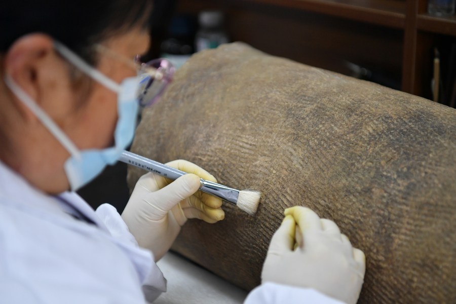 A staff member cleans cultural relics unearthed from the large-scale mausoleum located in Jiangcun Village on the eastern outskirts of Xi'an, northwest China's Shaanxi Province, Dec. 16, 2021. The large-scale mausoleum in Xi'an has been identified as belonging to Emperor Wendi of the Western Han Dynasty (202 BC-AD 25). (Xinhua/Zhang Bowen)