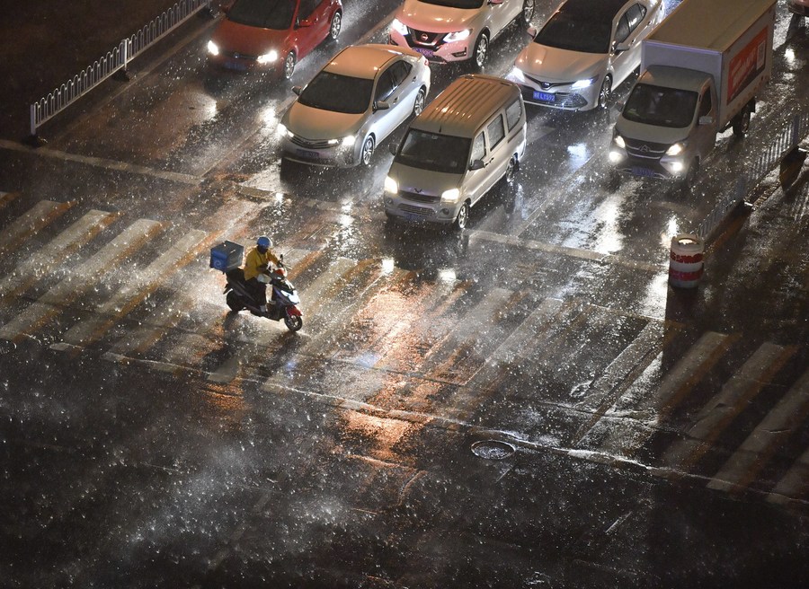 A delivery man rides on a road in the rain in Nankai District of Tianjin, north China, April 15, 2021. (Xinhua/Sun Fanyue)