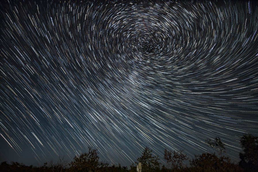 Photomontage taken on Sept. 1, 2021 shows the star trails over the Wudalianchi Geopark in Heihe, northeast China's Heilongjiang Province. (Xinhua/Xie Jianfei)