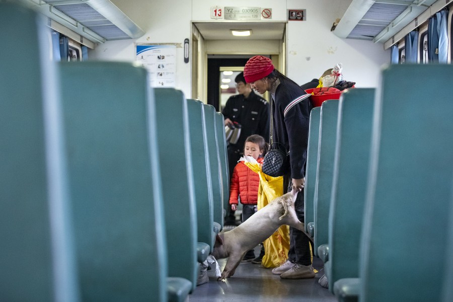 A piglet is seen on the No. 5633 train in southwest China's Sichuan Province, April 11, 2021. The 5633/5634 trains, a pair of slow-speed trains, still run through Daliang Mountains between Puxiong and Panzhihua of Sichuan Province. With an average speed less than 40 km per hour, the journey with 26 stations takes eleven hours and four minutes. The ticket prices range from 2 yuan to 25.5 yuan (about 0.3-3.9 U.S. dollars). The slow-speed trains send children to their schools, sick people to healthcare, and the locals to the world outside of the mountains. (Xinhua/Shen Bohan)