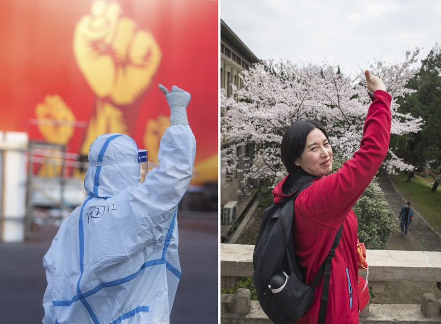 Combo photo shows medical staff Zhou Guohong giving a cheer-up gesture to colleagues at the temporary hospital converted from Wuhan Sports Center to combat the COVID-19 pandemic on Feb. 12, 2020 (L) and Zhou posing for a photo in front of cherry trees in Wuhan University during a free exclusive tour provided by the university for medical workers across China who had assisted Wuhan with the fight against the COVID-19 pandemic, on March 13, 2021, in Wuhan, central China's Hubei Province. (Xinhua/Xiao Yijiu)