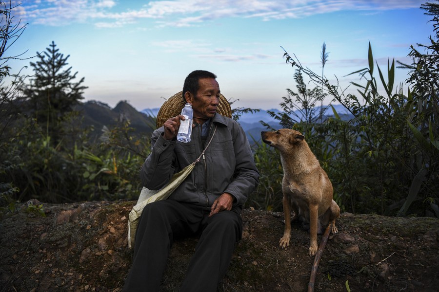 Lei Qiyuan, a village-level forest ranger, rests during a forest patrol at Tunying Village in Dongxiang Town of Wuxuan County, south China's Guangxi Zhuang Autonomous Region, Nov. 24, 2021. Lei is in charge of the management of about 5,800 mu (386.7 hectares) of forest. (Xinhua/Cao Yiming)