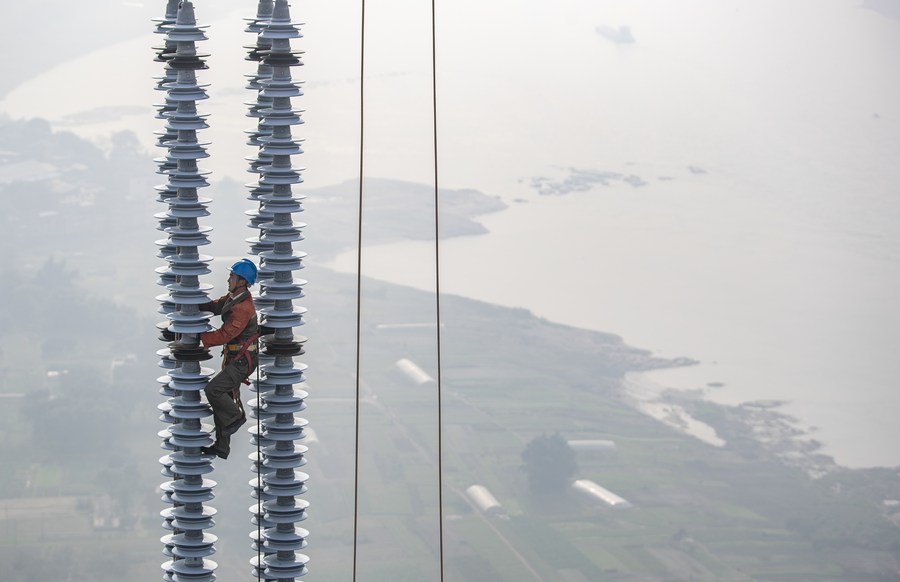 Photo taken on Dec. 5, 2021 shows a technician working at the construction site of the Chongqing section of the "Baihetan-Jiangsu" ultra-high-voltage (UHV) power transmission project over the Yangtze River in southwest China's Chongqing Municipality. (Xinhua/Huang Wei)