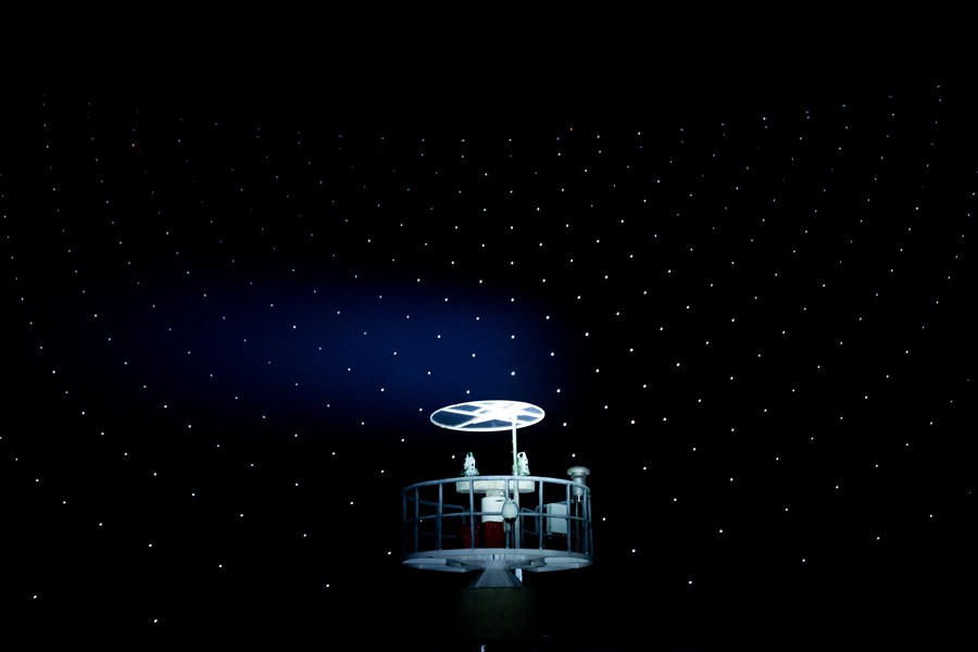 Photo taken on March 29, 2021 shows China's Five-hundred-meter Aperture Spherical Radio Telescope (FAST) under maintenance at night in southwest China's Guizhou Province. China's FAST officially opened to the world starting from March 31, 2021. (Xinhua/Ou Dongqu)