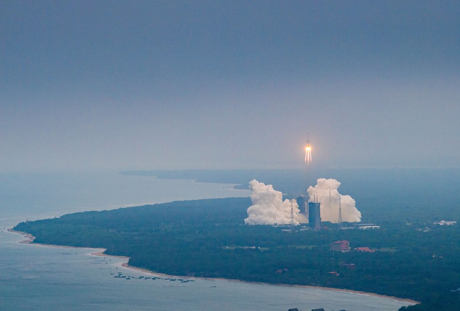The Long March-5B Y2 rocket, carrying the Tianhe module, blasts off from the Wenchang Spacecraft Launch Site in south China's Hainan Province, April 29, 2021. (Xinhua/Pu Xiaoxu)