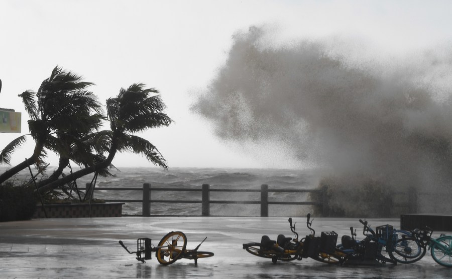 Huge waves lash the shore in Haikou, capital of south China's Hainan Province, Oct. 13, 2021. (Xinhua/Yang Guanyu)