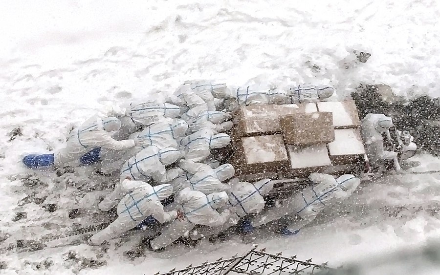 Volunteers push a tricycle on a slope to deliver daily necessities to students' dormitories on the campus of Dalian Ocean University under closed-off management for COVID-19 control, in Dalian, northeast China's Liaoning Province, Jan. 6, 2021. (Dalian Ocean University/Handout via Xinhua)