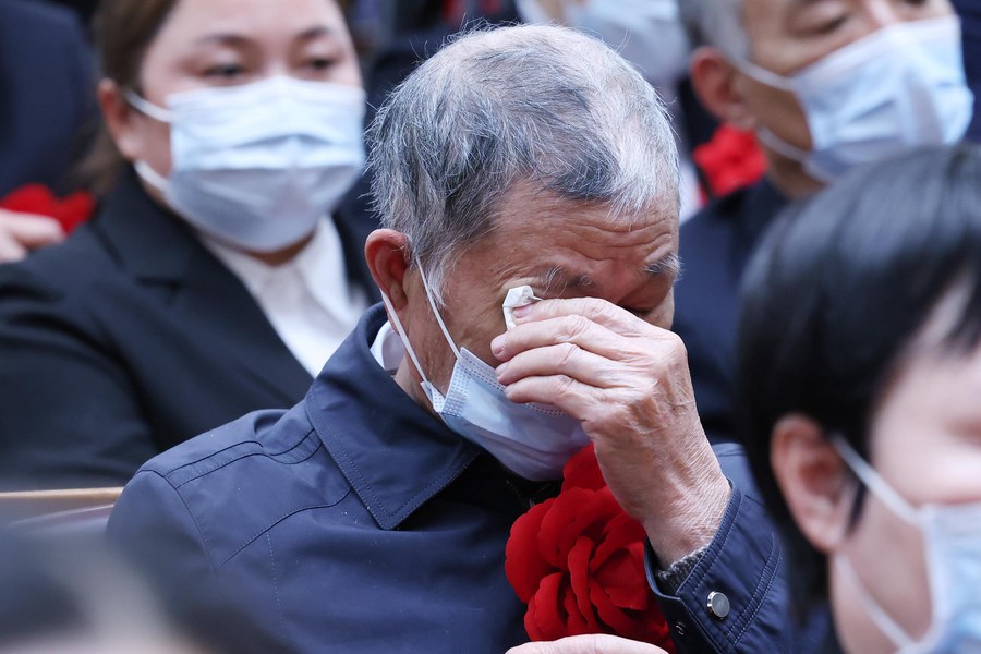 Huang Zhongjie, on behalf of his late daughter Huang Wenxiu, attends a grand gathering to mark the nation's poverty alleviation accomplishments and honor model poverty fighters at the Great Hall of the People in Beijing, capital of China, Feb. 25, 2021. Huang Wenxiu, who led the poverty-alleviation efforts in a village in Guangxi Zhuang Autonomous Region, died in a rain-induced flash flood on June 17, 2019, at the age of 30. (Xinhua/Liu Bin)