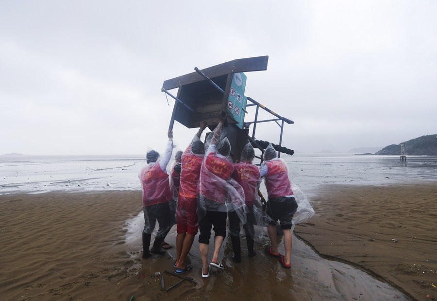 Volunteers lift up a lookout facility blown down by Typhoon Chanthu at the Nansha beach resort in Zhoushan, east China's Zhejiang Province, Sept. 14, 2021. (Xinhua/Xu Yu)