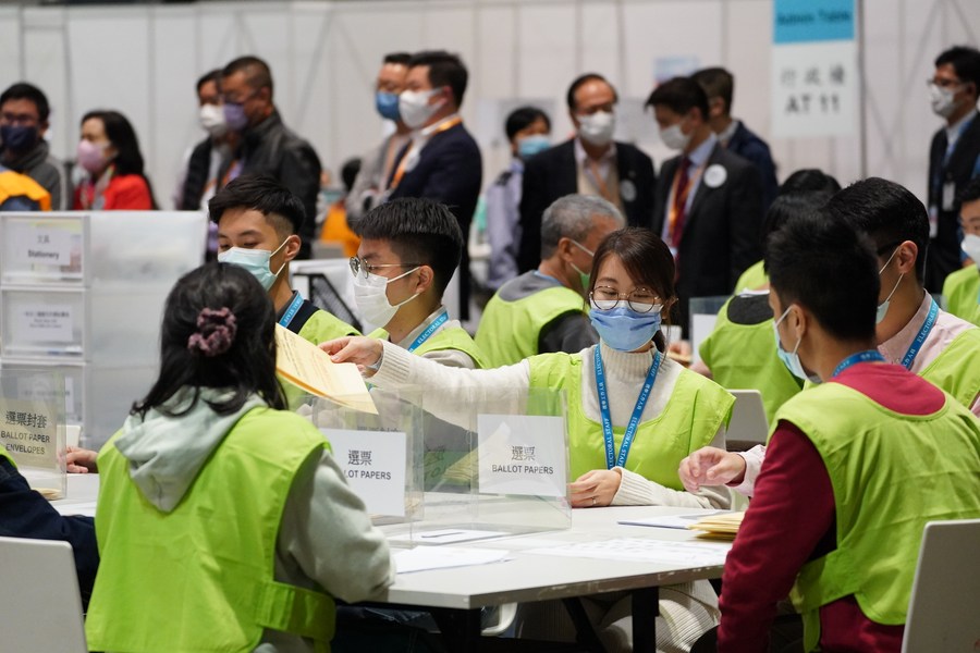 Staff members count ballots for the election for the seventh-term Legislative Council (LegCo) of the Hong Kong Special Administrative Region (HKSAR) in Hong Kong, south China, Dec. 19, 2021. Polls closed at around 11:00 p.m. local time (1500 GMT) on Dec. 19, 2021 in the election for the seventh-term LegCo of the HKSAR, the first since improvement to the HKSAR electoral system. (Xinhua/Lui Siu Wai)