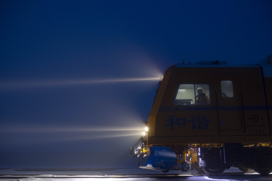 A snow removing machine, with workers on board, slowly pulls out of the garage of the Tiechanggou repairing team in Emin, northwest China's Xinjiang Uygur Autonomous Region, Jan. 21, 2021. Maytas, dubbed "Hell of Wind," is a wild area where the Karamay-Tacheng railway in Xinjiang runs through. It is also a place where the Tiechanggou repairing team under the China Railway Urumqi Bureau Group Co., Ltd. is on the watch 24 hours a day to ensure safe operation of all trains passing by. (Xinhua/Hu Huhu)
