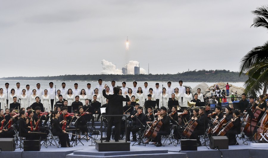 Members of Xi'an Symphony Orchestra perform near the Wenchang Spacecraft Launch Site in south China's Hainan Province, April 29, 2021. China sent into space the core module Tianhe of its space station on April 29, 2021. (Xinhua/Guo Cheng)