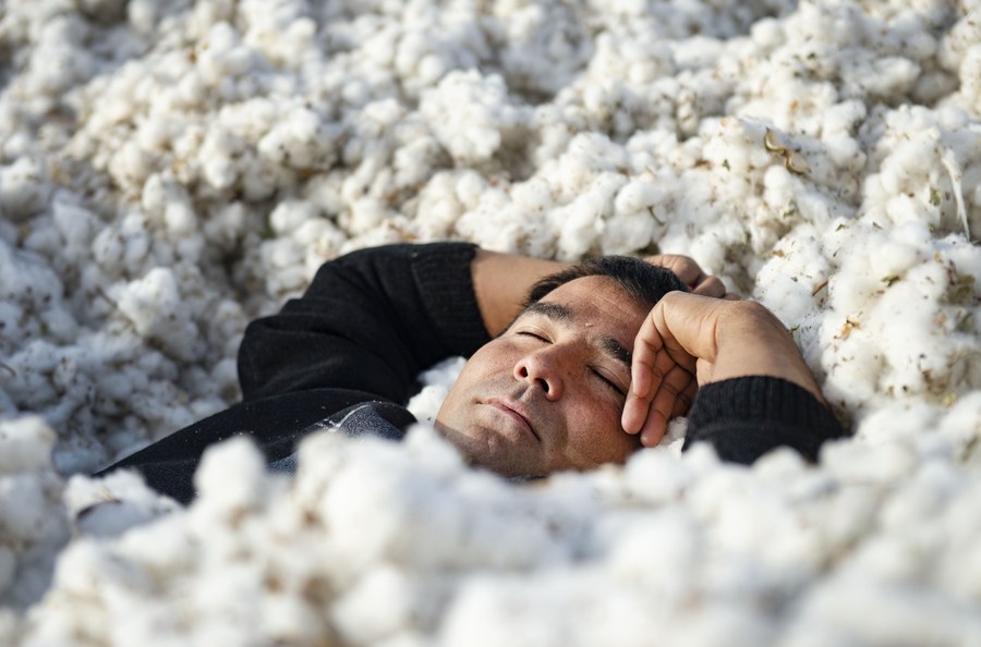 Amar Aziz takes a nap in a cotton pile in Toyboldi Township of Xayar County in Aksu Prefecture, northwest China's Xinjiang Uygur Autonomous Region, Oct. 26, 2021.