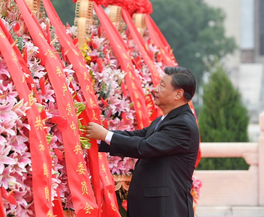 Xi Jinping straightens the red ribbons on flower baskets during a ceremony offering floral tribute to fallen national heroes on Tian'anmen Square in Beijing, capital of China, Sept. 30, 2021. Xi Jinping and other leaders of the Communist Party of China and the state, including Li Keqiang, Li Zhanshu, Wang Yang, Wang Huning, Zhao Leji, Han Zheng and Wang Qishan, attended the ceremony on Sept. 30, 2021 on Tian'anmen Square in central Beijing.