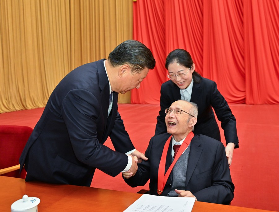 Chinese President Xi Jinping, also general secretary of the Communist Party of China Central Committee and chairman of the Central Military Commission, talks with aircraft designer Gu Songfen, winner of China's top science award, after an annual ceremony to honor distinguished scientists, engineers and research achievements at the Great Hall of the People in Beijing, capital of China, Nov. 3, 2021. (Xinhua/Li Xueren)