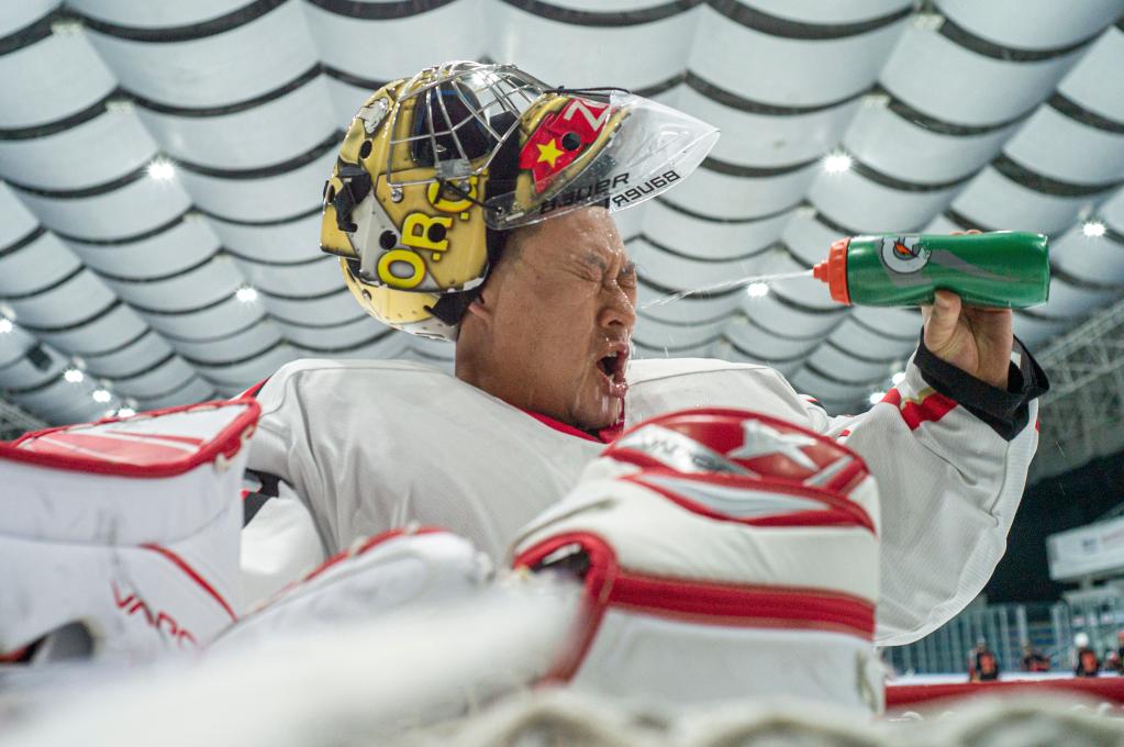 Goalkeeper Zhou Yunjie of Team 1979 sprays water to cool himself before an ice hockey match in Beijing, capital of China, Jan. 30, 2021. Main players of Team 1979 of Beijing are retired ice hockey players from Beijing Shichahai Sports School in the 1970s. Encouraged by the successful bid for the 2022 Beijing Winter Olympic Games, 9 of the ice hockey veterans began training again in Wukesong ice rink in 2015 and named their team 1979, the year when their team in Shichahai Sports School was dismissed. Now Team 1979 has grown up to more than 40 members with an average age of 60 years. They have training matches every Wednesday and Saturday. (Xinhua/Wu Zhuang)