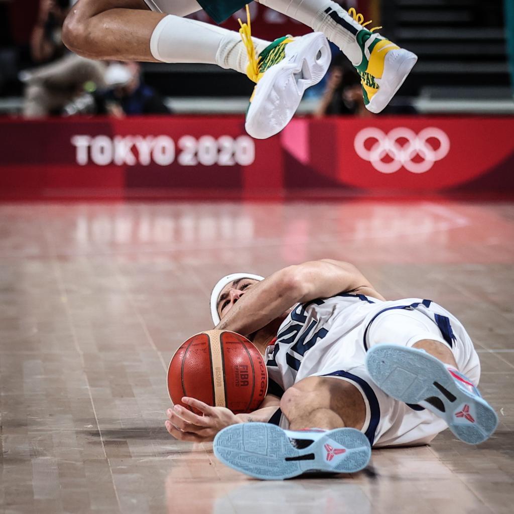 Devin Booker (bottom) of the United States falls down during the men's basketball semifinal between the United States and Australia at Tokyo 2020 Olympic Games in Saitama, Japan, Aug. 5, 2021. (Xinhua/Pan Yulong)