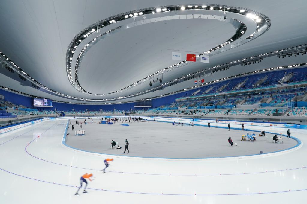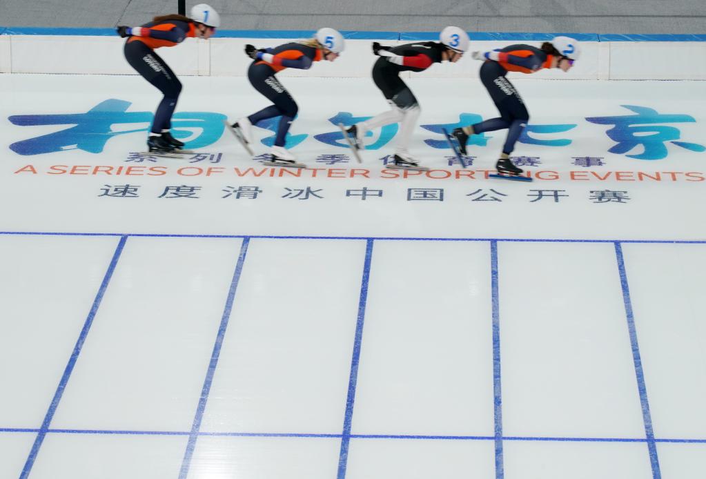 Skaters of the Netherlands compete in the women's 1500m competition at the Experience Beijing Speed Skating China Open in Beijing, China on Oct. 10, 2021. (Xinhua/Zhang Chenlin)