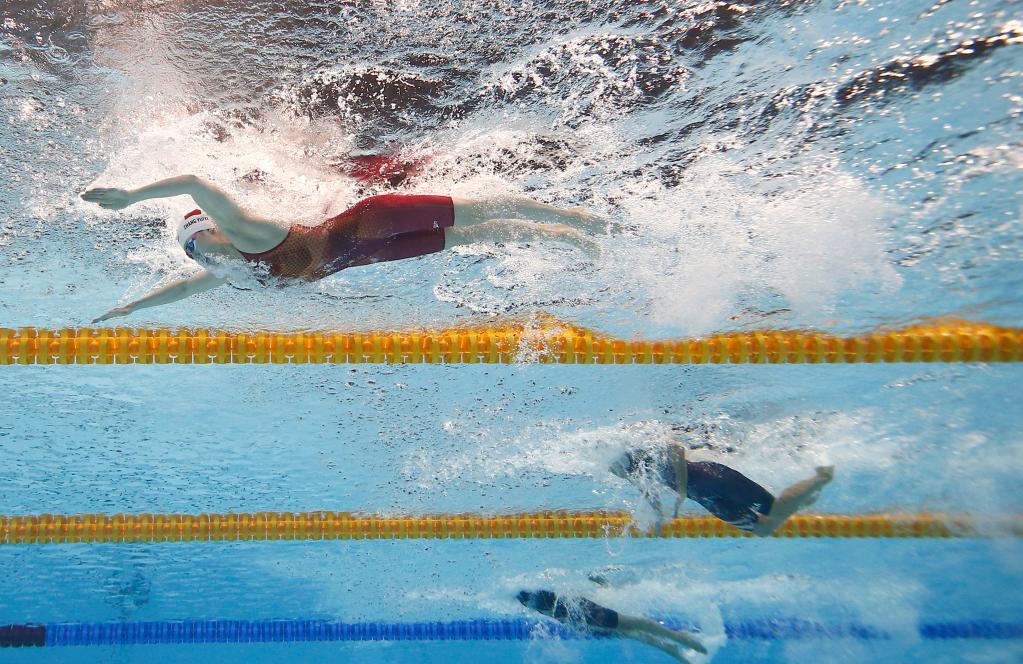 Photo taken by an underwater camera shows Zhang Yufei (L) of China competing during the women's 200m butterfly final at the Tokyo 2020 Olympic Games in Tokyo, Japan, July 29, 2021. Zhang Yufei claimed the title of the event. (Xinhua/Ding Xu)