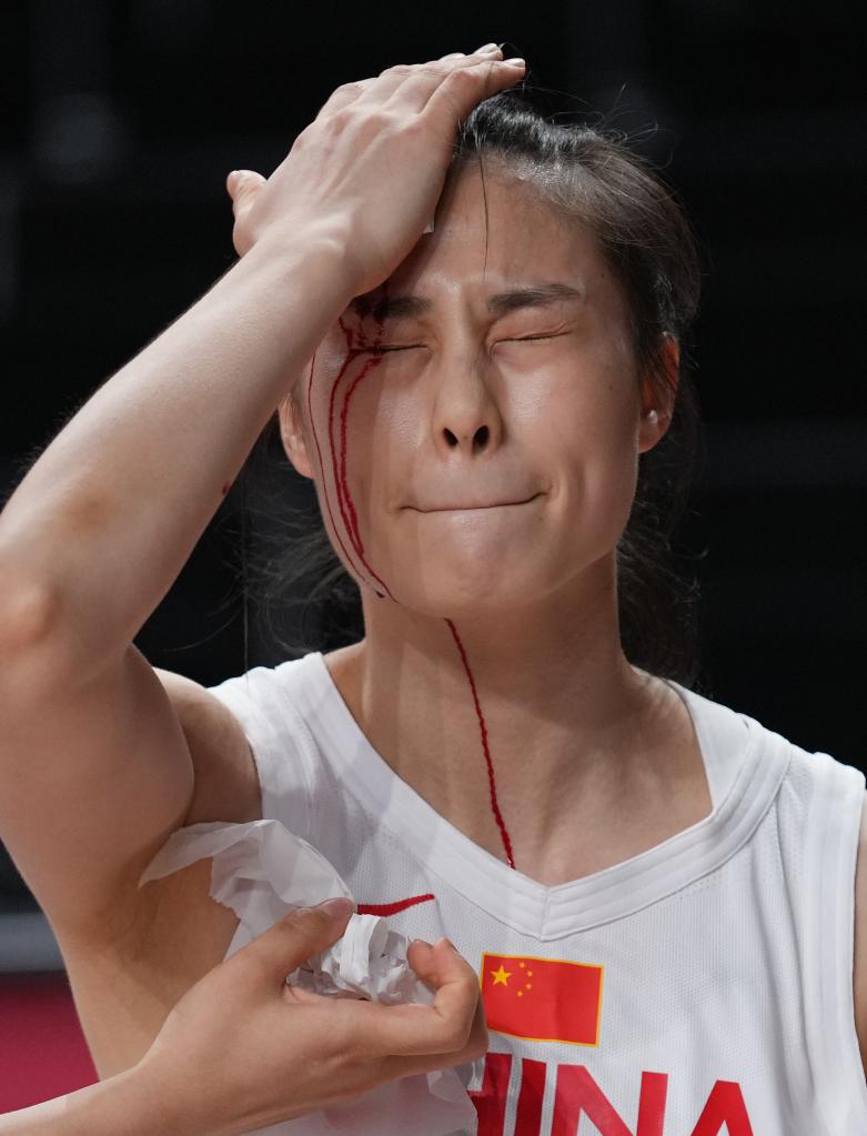 Wang Siyu of China gets injured during the women's basketball preliminary match of Group C between China and Australia at the Tokyo 2020 Olympic Games in Saitama, Japan, July 30, 2021. (Xinhua/Meng Yongmin)
