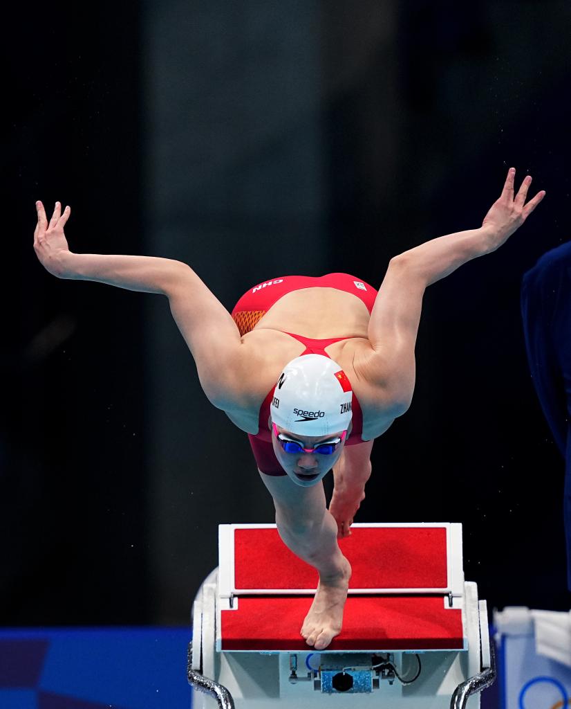 Zhang Yufei of China enters water during the women's 200m butterfly final at the Tokyo 2020 Olympic Games in Tokyo, Japan, July 29, 2021. Zhang Yufei claimed the title of the event. (Xinhua/Xu Chang)