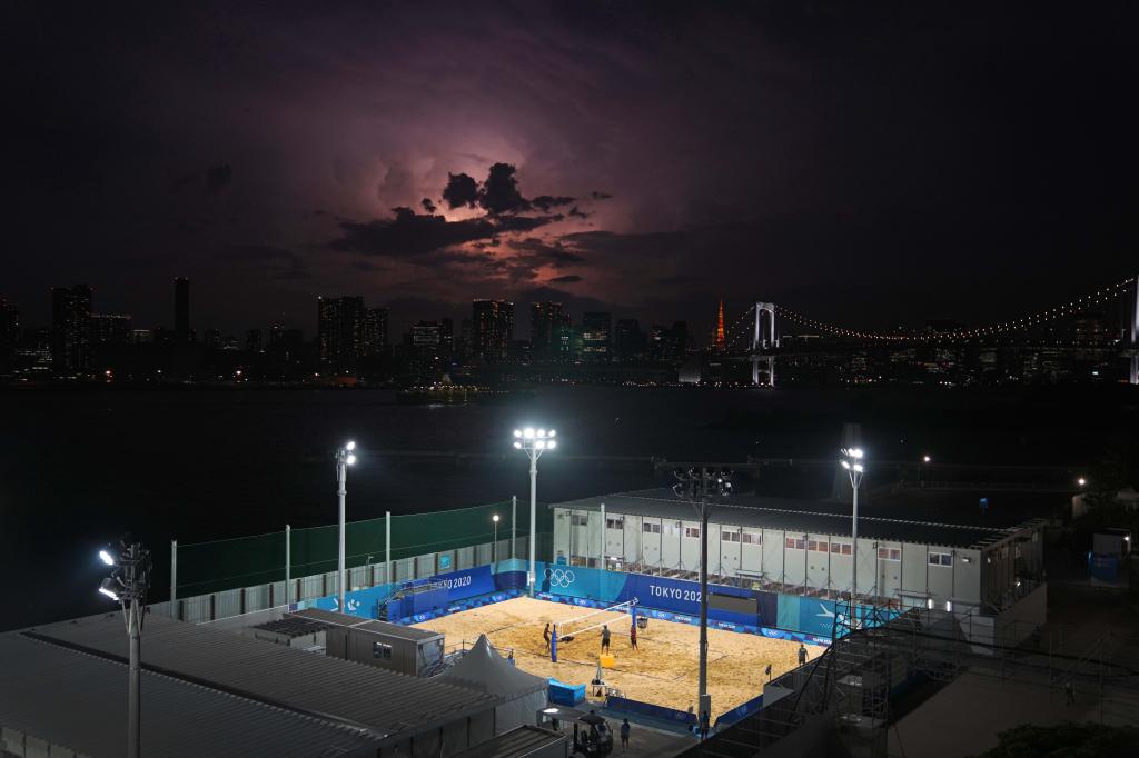 A lightening strikes over the Tokyo Bay as Cherif Younousse (1st L)/Ahmed Tijan of Qatar train before their men's beach volleyball preliminary match against Enrico Rossi/Adrian Ignacio Carambula Raurich of Italy at Tokyo 2020 Olympic Games in Tokyo, Japan, July 28, 2021. (Xinhua/Li Ga)