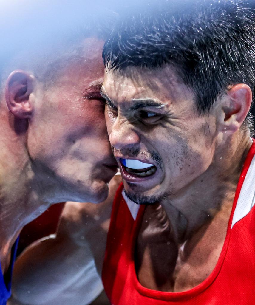 Zakir Safiullin (R) of Kazakhstan competes during the boxing men's light (57-63kg) quarterfinal against Harry Garside of Australia at the Tokyo 2020 Olympic Games in Tokyo, Japan, Aug. 3, 2021. (Xinhua/Ou Dongqu)
