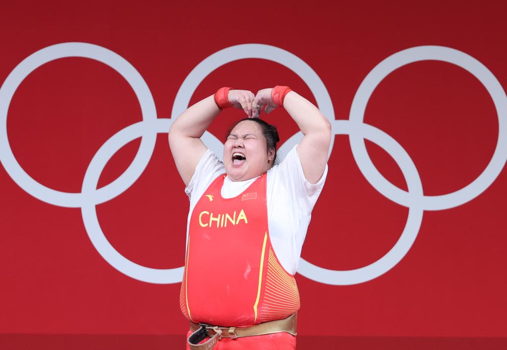 Li Wenwen of China reacts after winning the Weightlifting Women's +87kg Final at Tokyo 2020 Olympic Games in Tokyo, Japan on Aug. 2, 2021. (Xinhua/Yang Lei)