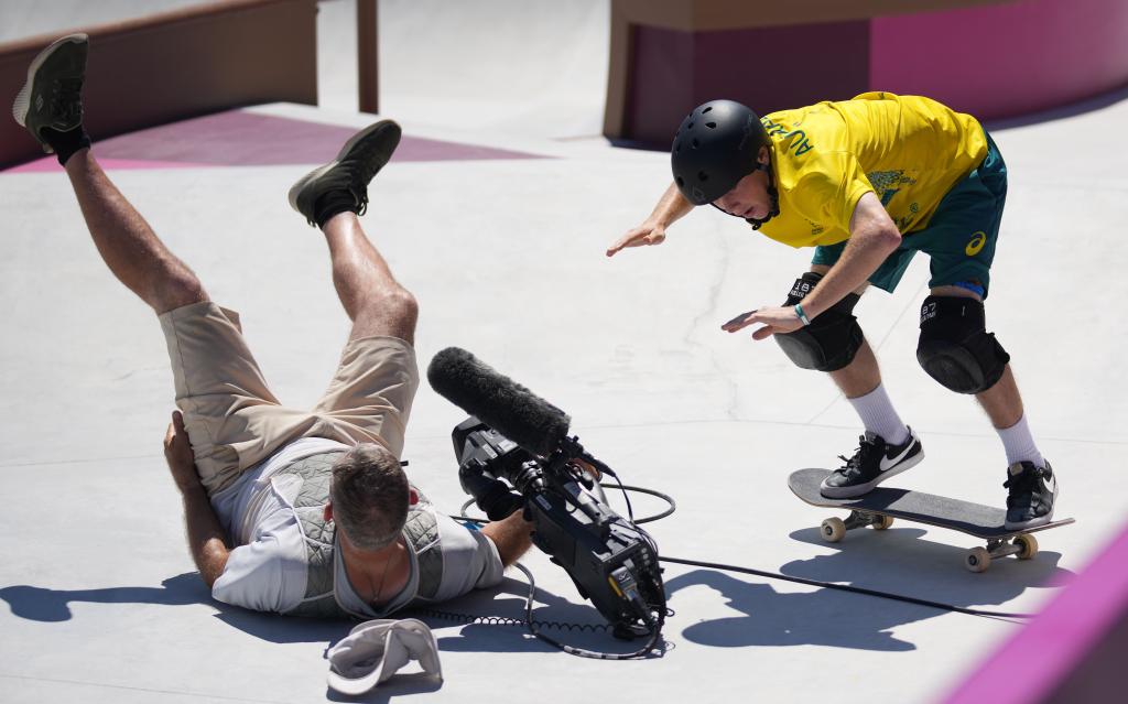 Keegan Palmer (R) of Australia clashes into a cameraman during the men's park heat of skateboarding at the Tokyo 2020 Olympic Games in Tokyo, Japan, Aug. 5, 2021. (Xinhua/Li Ga)