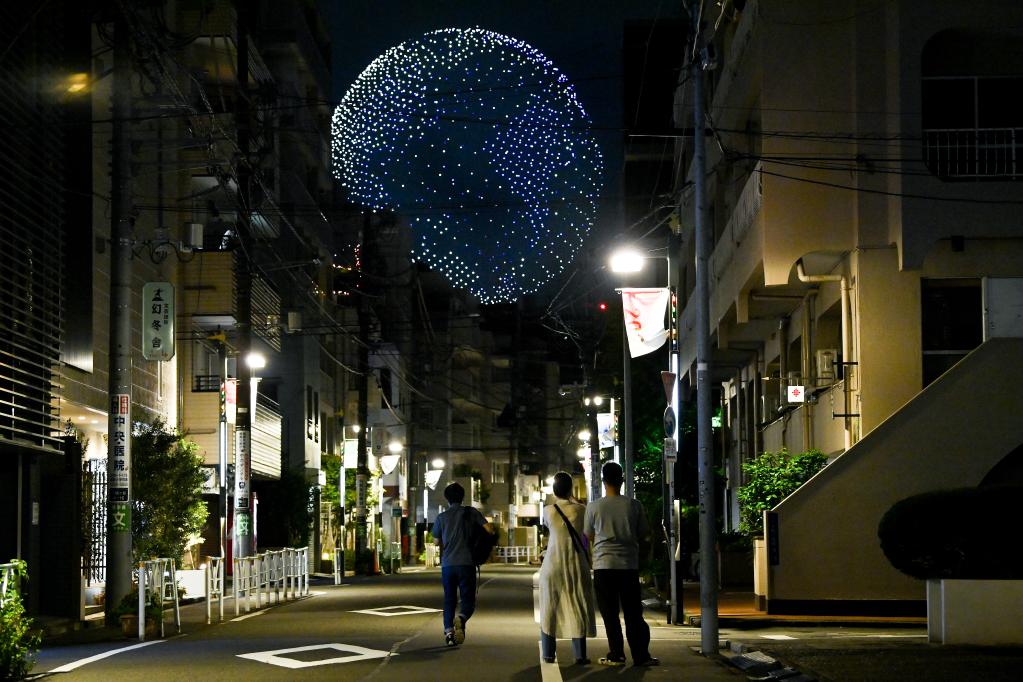 Citizens look at the earth formed by a fleet of drones during the opening ceremony of the Tokyo 2020 Olympic Games on a street in Tokyo, Japan, July 23, 2021. (Xinhua/Du Yu)