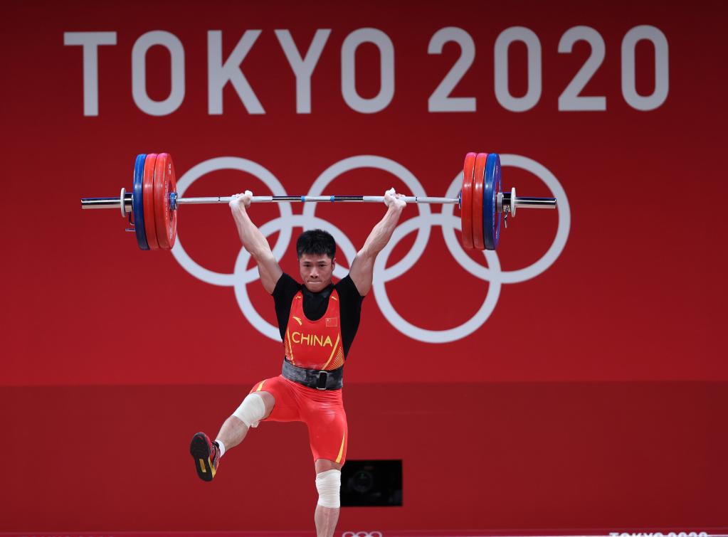 Li Fabin of China competes during the men's 61kg weightlifting event of the Tokyo 2020 Olympic Games in Tokyo, Japan, July 25, 2021. (Xinhua/Yang Lei)