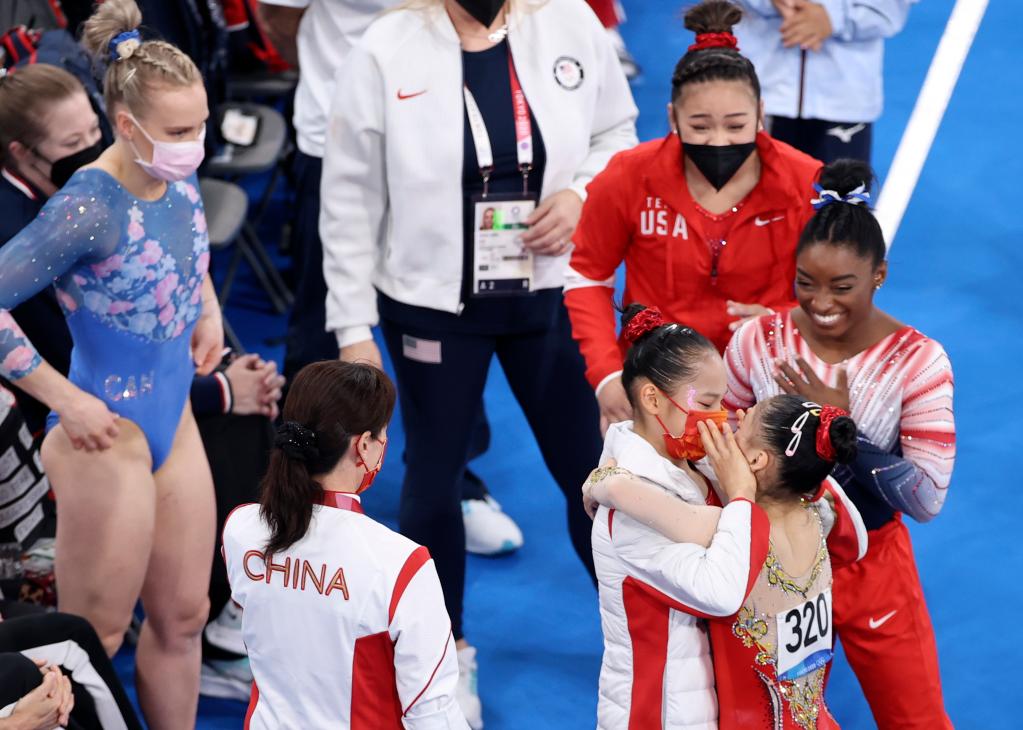 Guan Chenchen (bottom, R) of China celebrates with teammate Tang Xijing (bottom, C) after winning the artistic gymnastics women's balance beam final at the Tokyo 2020 Olympic Games in Tokyo, Japan, Aug. 3, 2021. (Xinhua/Zheng Huansong)