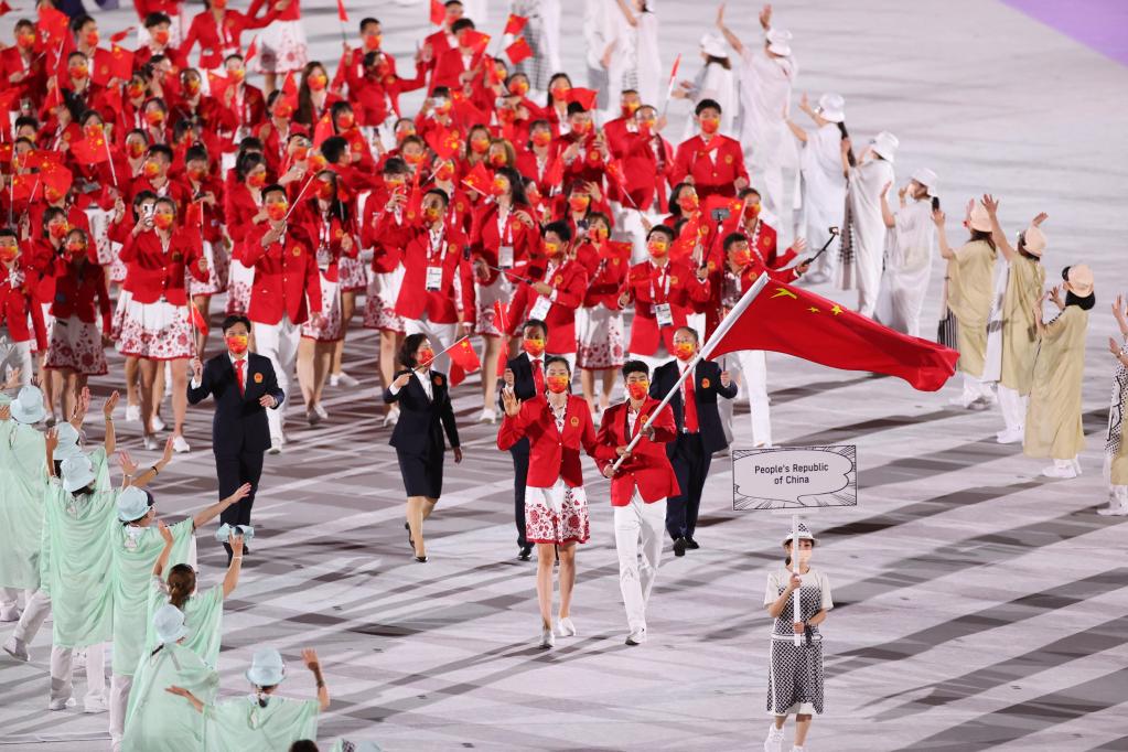 Led by flag bearers Zhu Ting and Zhao Shuai, the Olympic delegation of China parade into the Olympic Stadium during the opening ceremony of Tokyo 2020 Olympic Games in Tokyo, Japan, July 23, 2021. (Xinhua/Zheng Huansong)