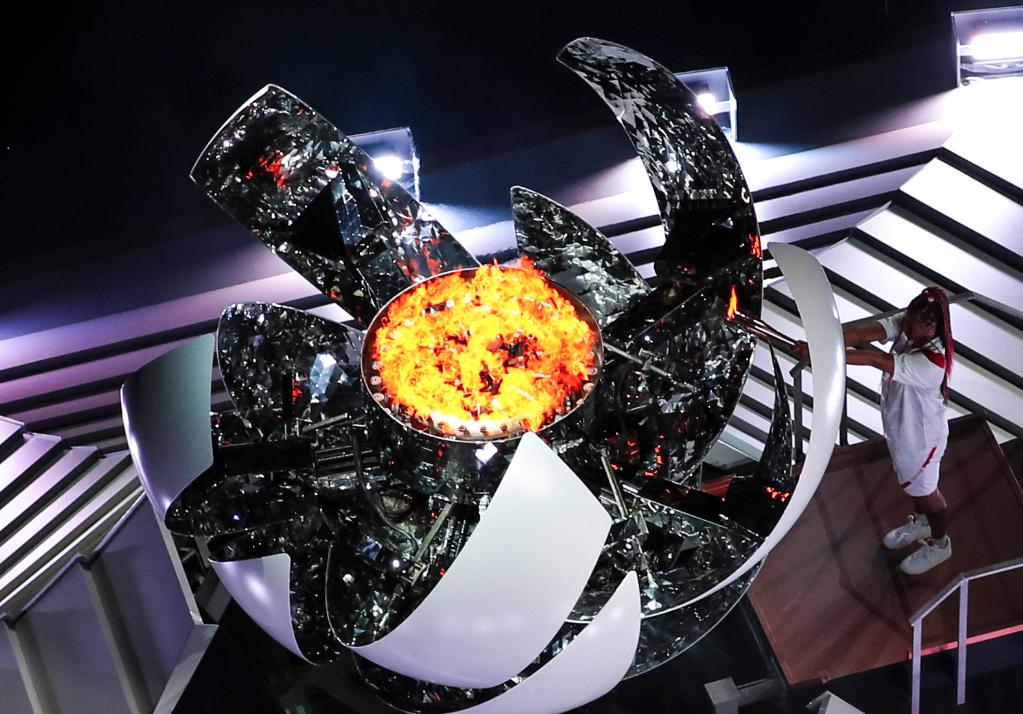 The cauldron is lit by Japanese athlete Osaka Naomi during the opening ceremony of the 2021 Tokyo Olympic Games at the Olympic Stadium in Tokyo, Japan, July 23, 2021. (Xinhua/Xia Yifang)
