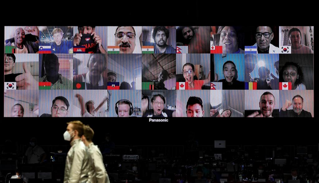 A screen shows the audiences watching the live of a fencing men's sabre team match held at the Tokyo 2020 Olympic Games in Chiba, Japan, on July 28, 2021. (Xinhua/Li Ming)