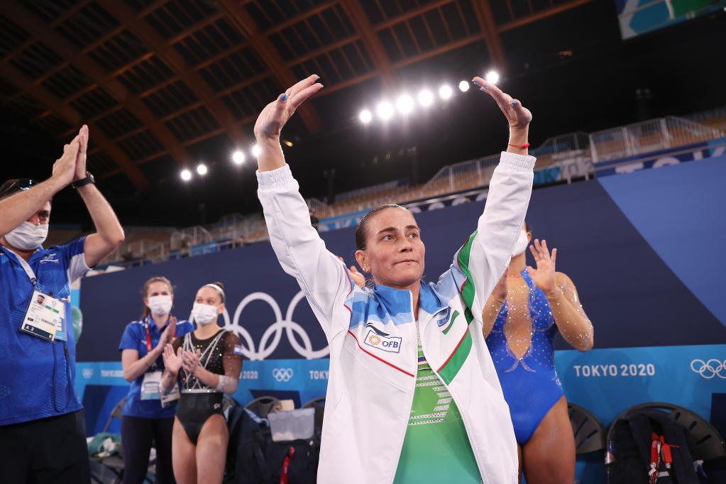 Oksana Chusovitina of Uzbekistan reacts after the women's artistic gymnastics qualification at the Tokyo 2020 Olympic Games in Tokyo, Japan, July 25, 2021. (Xinhua/Cao Can)